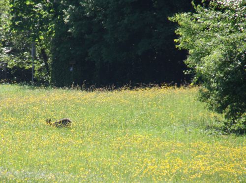 Eben grad hab ich eine Ricke beobachtet, die bei ihrem Kitz war. Sie lag auch kurz bei ihm, bevor sie wieder zurück in den Wald verschwand.