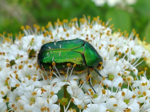 Und nebenan sitzt ein großer Rosenkäfer und zutzelt sich sein Frühstück. Oder ists schon Essenszeit?
