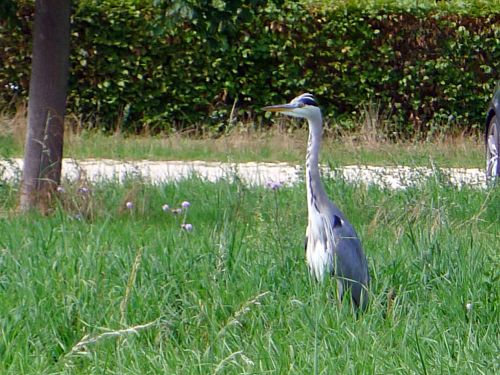 Dieser hübsche Graureiher erwartet uns direkt vorm Stellplatz, und dann darf Carl sich wieder austoben. Er kennt schon den Weg zur Wasserstelle.