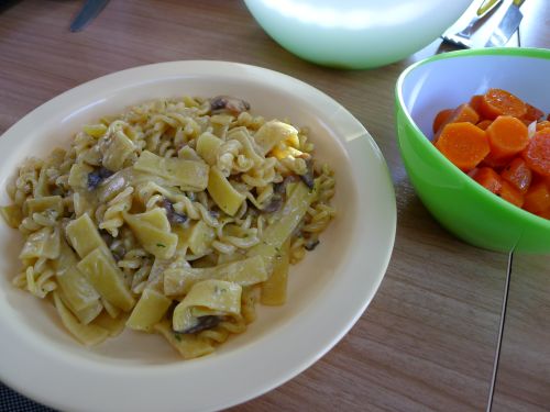 Zum Abendessen gibts One-Pot-Nudeln mit Rahmsoße und Champignons, und hinterher warten wir auf Promi-BB.