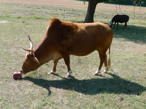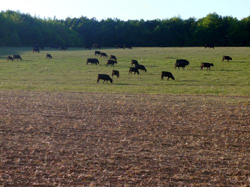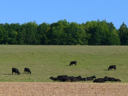 Heute sind die Rinder wieder weiter unten. Mitten drin sitzt ein Bussard und