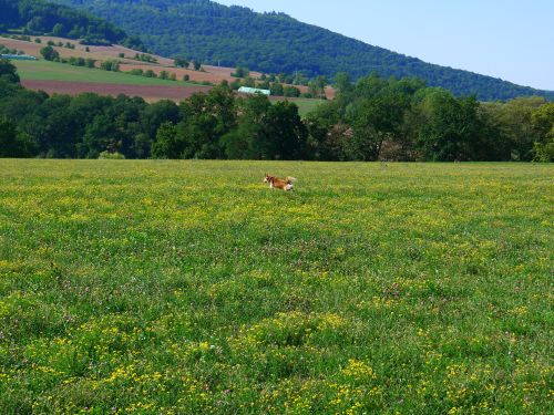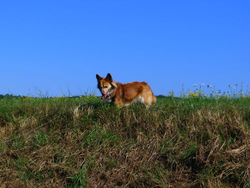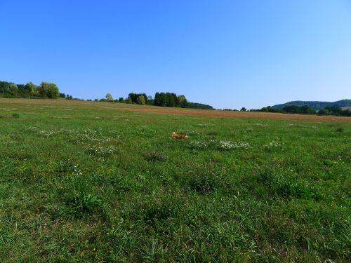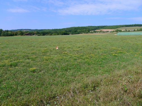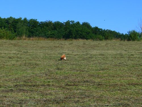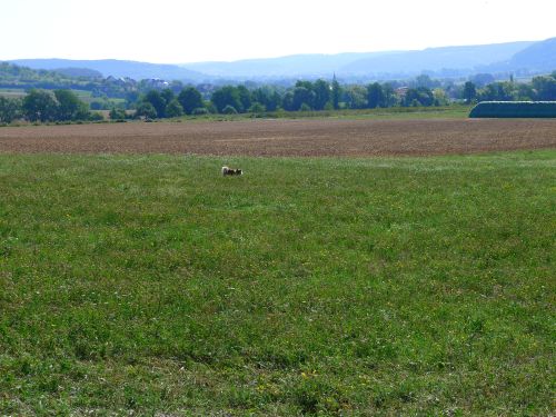 Carl darf springen und er genießt es, wie ein Flummi im Mäuselsprung über die Wiesen zu hüpfen. Und zwischendurch hält er kurz an, und am Schütteln sehen wir, dass er mal schnell gemäuselt hat. Es ist grausam, ich weiß, aber leider ists nicht zu verhindern. Oben kreist der Milan und 100m weiter stehen drei Reiher. Einer von denen - ich tippe auf den Milan - holt sich dann die erlegte Beute.