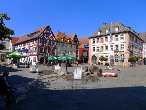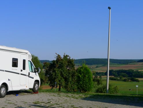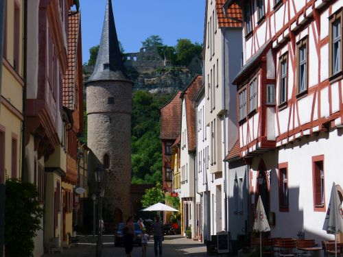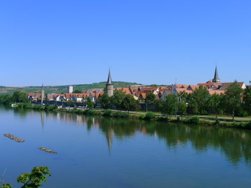 Der Stellplatz ist direkt unterhalb der Karlsburg am Mainufer auf der dem Städtchen gegenüberliegenden Seite. Man sieht aber vor lauter Gebüsch den Main nicht. Und der davor verlaufende Radweg ist ziemlich stark befahren. Aber egal. Wir gehen erst mal rüber ins Städtchen.