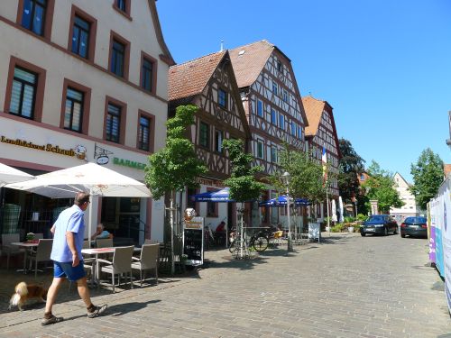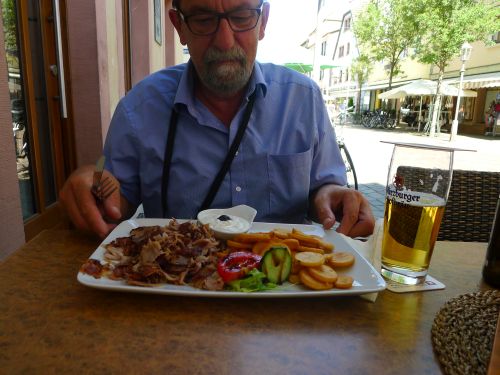 Es gibt jede Menge Straßencafes und Gaststätten, und es gibt auch Schäufele und Ochsenbäckchen, aber bei der Hitze geht so eine mächtige Mahlzeit garnicht. Wir landen bei einem fränkischen Türken und bestellen uns einen Dönerteller, der aber irgendwie ganz anders heißt.