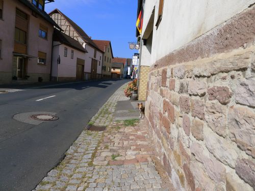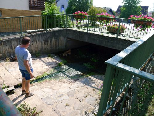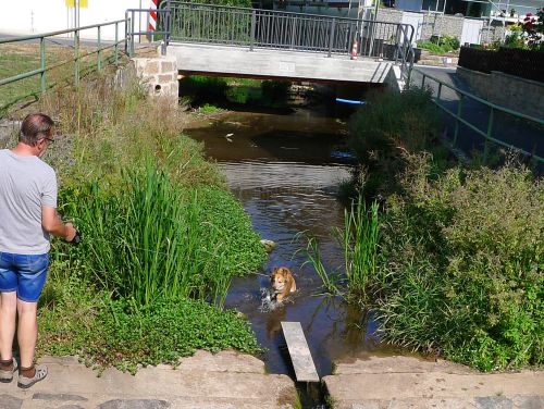Mäusejagd macht durstig. Er ist jetzt gestärkt, hat sich dabei die Pfoten gekühlt, und weiter gehts durch die langgezogene Ortschaft, bis wir endlich am Kirchturm sind,