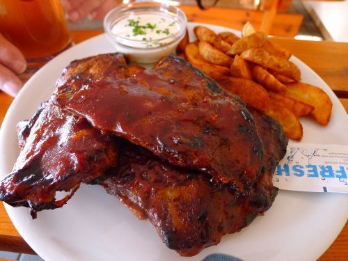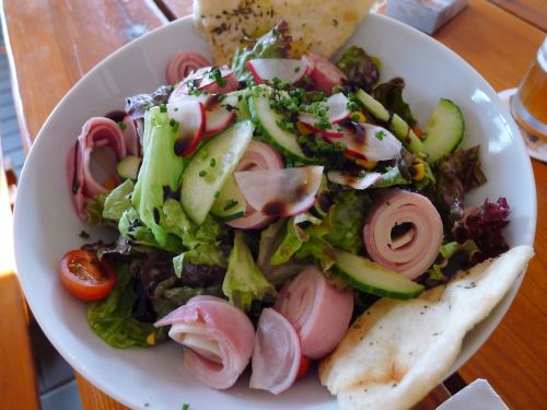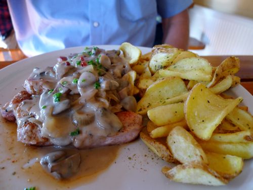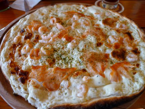 Peter hatte tatsächlich 3 Nackensteaks, aber ich nur einen Flammkuchen mit Lachs und Shrimps. Wir waren beide pappsatt.