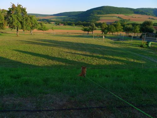 Beim Mittagsschlaf finde ich leider keine Ruhe. Außerdem fehlt uns die Aussicht, und rechts sehen wir auf das große Zementwerk. Und eine halbe Stunde später stehen wir wieder beim Kalli oben, haben freie Sicht auf die Friede-Freude-Eierkuchen-Landschaft, auf die Rinder, Esel und Pferde, oben kreist der Milan, und unsre Welt ist wieder in Ordnung.