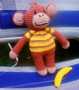 Übrigens reagiert Lennard, für den ichs Äffchen eigentlich fabriziert hab, aufs Bild so, dass er die Banane gut findet und sie haben will. Klasse. Wozu strampel ich mich mit dem komplizierten Affen ab. Ab morgen häkel ich halt Bananen.