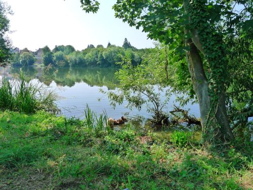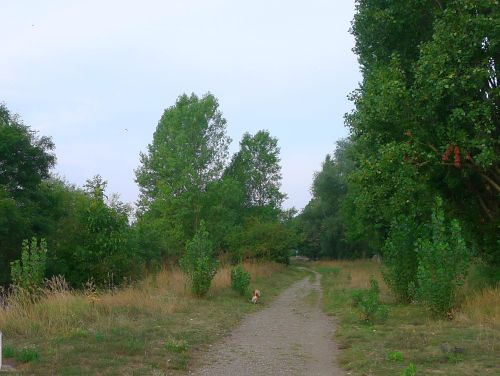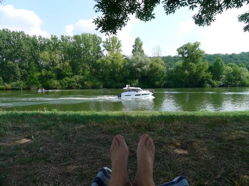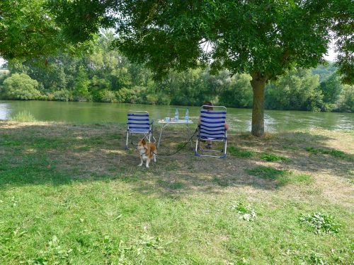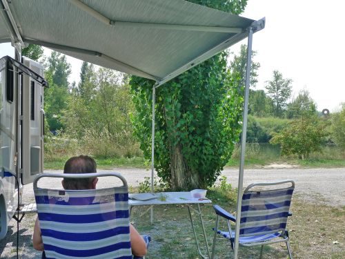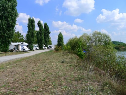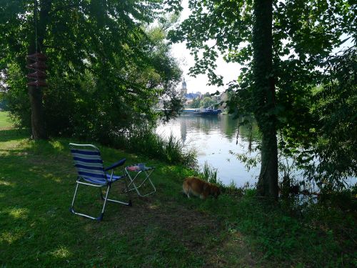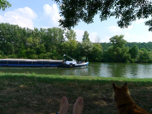 Wir stehen in der ersten Reihe neben einer dicken Pappel, die uns Schatten gibt. Die Schiffe sehen wir auch, die Nachbarn sind nett, Spazierwege gibts ohne Ende, alles ist gut.