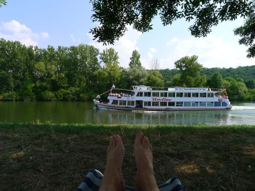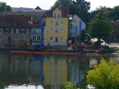 Gegenüber wird das Mainufer neu befestigt. Seit 2013 ists schon marode, aber genau jetzt, 6 Jahre später, als wir hier in Ruhe sitzen wollen, sanieren sie.