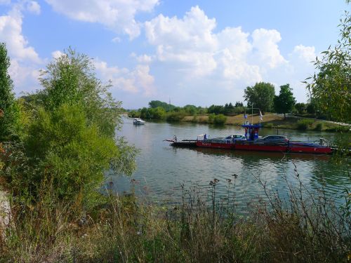 ...... und von der Schleuse aus auf die Fähre. Rechts davon ist der Wohnmobilstellplatz. An der linken Pappel guckt ein Womo raus.