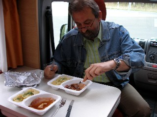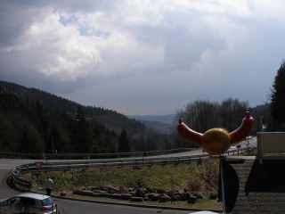 Dort gibts das mitgebrachte Kantinenessen, Grillschinken mit Kartoffelsalat. "Lecker" verkneif ich mir, denn der Zweck heiligt die Mittel, und dann gehts wirklich los. Problemlos kommen wir an Schlüchtern vorbei und fahren über Gersfeld durch die Rhön Richtung Bad Neustadt und dann auf der A71 gen Norden. Den Thüringer Wald hab ich mir eigentlich ganz anders vorgestellt. Irgendwie siehts nach Voralpenland aus und es ist kaum zu glauben, dass sich die Landschaft kaum 3 Stunden von zuhause weg so verändert. Hier müssen wir nochmal her, aber ohne Autobahn, um die Landschaft zu genießen. Die Autobahn führt über viele Talbrücken durch eine hügelige Landschaft mit herrlicher Fernsicht,