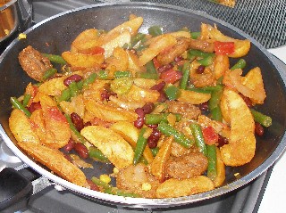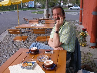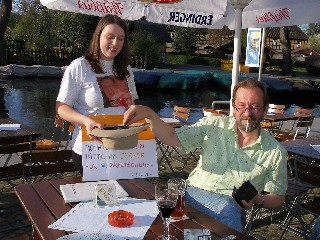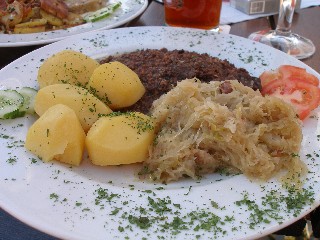 und am Kahnhafen übermannt uns der Hunger und Peter bestellt Eisbeinsülze mit Bratkartoffeln, bei mir gibts Finsel, also Grützwurst mit Sauerkraut, das ist Blutwurst ohne Haut, wie bei uns beim Schlachtessen die "schwarz Brüh". Lecker.