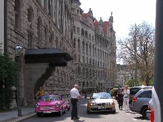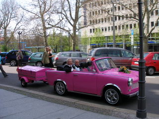 In Leipzig finden wir einen Parkplatz direkt vorm Standesamt, und gerade fährt ein nettes Paar zur Absegnung der gleichgeschlechtlichen Beziehung in einem noch netteren Gefährt vor. Stilvoll in puschelpink.