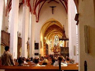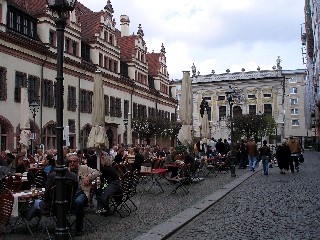 Die Thomaskirche erweist sich als recht schmuckloses Gotteshaus, aber ich durfte die Probe des Thomanerchores miterleben. Naja, ich steh nicht wirklich drauf, aber scheinbar ists gut, denn alle Besucher hören andächtig zu. Zwischenzeitlich verdient sich mein Peter zwei Euro, indem er draußen die Mitglieder einer Touri-Gruppe einzeln und in der Gruppe gemeinsam vor der Bach-Statue knipst.