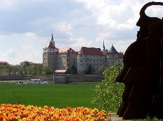 Blick auf Torgau mit dem Doppelkopfdenkmal vor der Brückenkopfkaserne (Gefängnis, oder auch Straf- und so genanntes "Konzentrationslager für die Truppe" aus alten Zeiten). Bilder von dort verkneif ich mir, weil ich meine Urlaubsstimmung behalten will.