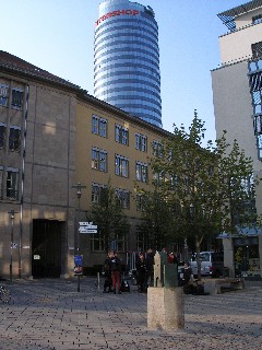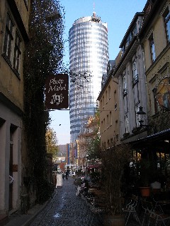 Für 8,80 € (Gruppentageskarte, weils mit Brunos Kindertarif sonst noch teurer geworden wäre) fahren wir mit der Tram in die Stadt. Der Turm des Centers "neue Mitte Jena" überragt alles und von jeder Straße aus kann man ihn sehen.