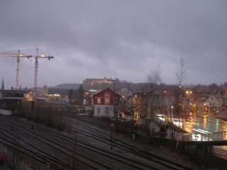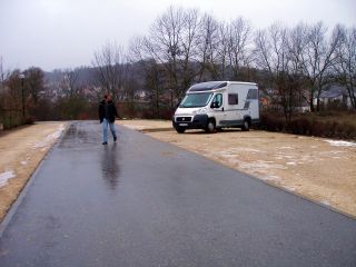 Nun stehen wir in Heidenheim, es regnet, überall Schneereste...