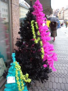 Irgendwie versteh ich was nicht, aber es scheint der Lauf der Zeit zu sein, dass vom Ursprung der Weihnacht nix mehr übrig geblieben ist. Aus dem Christkind wurde ja der Weihnachtsmann, warum sollten nicht aus grünen Tannen schwarze, gelbe, türkis- und pinkfarbene Plastikpuschel werden.